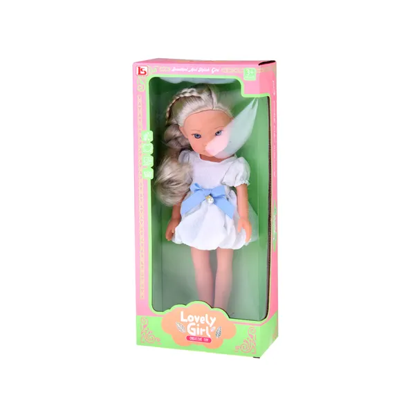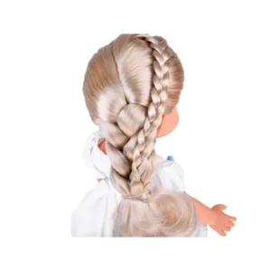 A bájos, 33 cm magas baba hosszú, világosszőke hajával és elegáns, fehér ruhájával azonnal elvarázsolja a gyerekeket. A kék masni és a gyöngyszerű dísz különleges megjelenést kölcsönöz neki, miközben a fehér balerinacipő teszi teljessé az outfitet.