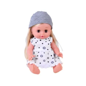 A készlet tartalmaz egy gyönyörű babát barna szemekkel és hosszú, szőke hajjal. Egy bájos fehér pöttyös ruhát visel. Az öltözéket egy szürke, vékony kalap egészíti ki, ami tökéletes a sétákhoz. A baba szemei becsukódnak, így aludni is tud. A játék törzse műanyagból készült, a feje, karjai és lábai pedig gumiból.