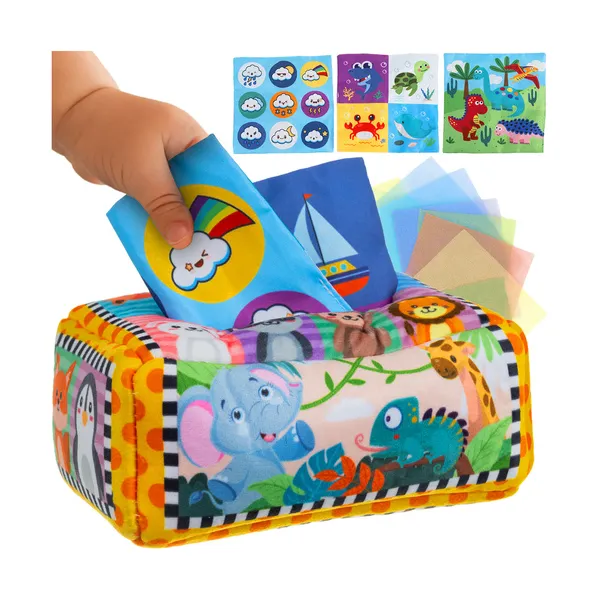 • Montessori textil zsebkendőszortírozó doboz babáknak, színes, 0+