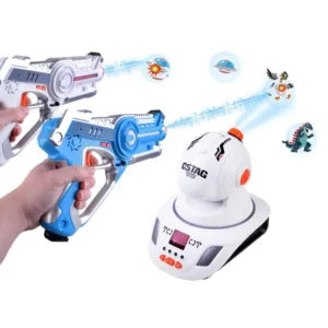 • Két lézeres pisztoly projektorral, amely repülő célpontokat vetít – ez a játék rengeteg izgalmat nyújt és hosszú órákra leköti a gyerekeket. A modern infravörös lézerpisztolyok új dimenzióba helyezik a játékot. Ez egy fantasztikus ötlet a célba lövésre azoknak a gyerekeknek, akik szeretik a modern technológiákat. A játék során a gyerekek gyakorolják a pontosságot, a reflexeket és a koncentrációt. A pisztolyok nem igényelnek lőszert. A golyókat kódolt infravörös fényjel váltja fel, amit köznyelven lézernek neveznek. A játékban alkalmazott fény- és hangeffektek tovább fokozzák az izgalmakat és még jobban motiválják a játékost. A játékkal egyedül vagy barátokkal is lehet játszani. Minden elem kiváló minőségű műanyagból készült.