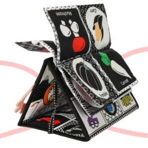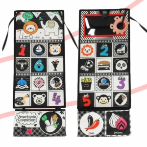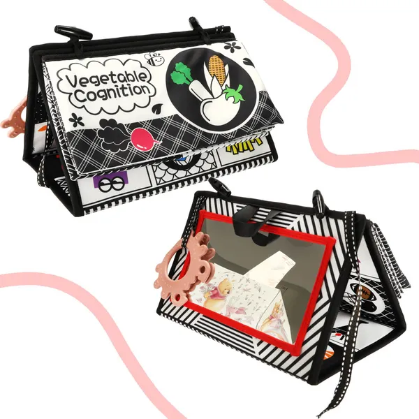 A kontrasztos mintájú, hajtogatható textilkönyv hangos zörgőkkel, akril tükörrel és puha szilikon rágókával egyszerre fejleszti babád látását, hallását és tapintását. Rögzíthető a kiságyhoz vagy magatokkal vihetitek sétára, így mindenhol biztonságos játékot kínál.