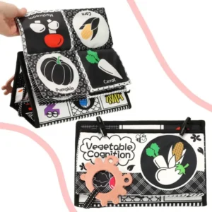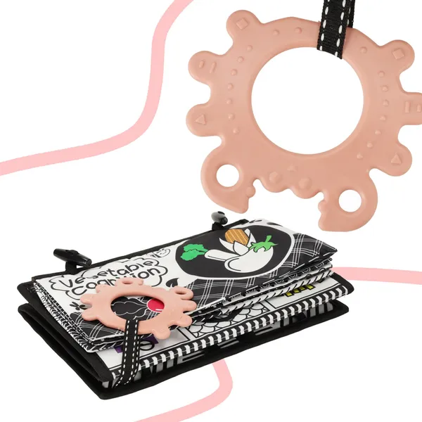 A babák az első hónapokban a kontrasztos, fekete-fehér mintákat érzékelik a legkönnyebben, ezért ez a puha textilkönyv/rácsvédő hatékonyan vonzza a tekintetet és ösztönzi a szem–kéz koordinációt. A termék többféle módon rögzíthető a kiságy rácsára, de útközben a babakocsira is felcsatolható.