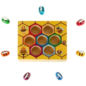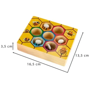 Az élénk színű, natúr fából készült méhsejt kirakó játék tökéletes első Montessori eszköz a finommotorika és a színegyeztetés gyakorlásához. A gyermek feladata, hogy a mellékelt csipesszel kiemelje a 7 különböző színű méhecskét, majd visszahelyezze őket a megfelelő színű hatszög alakú üregekbe.