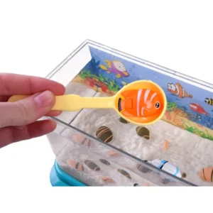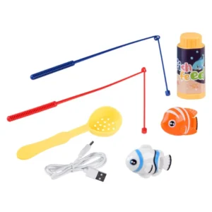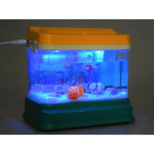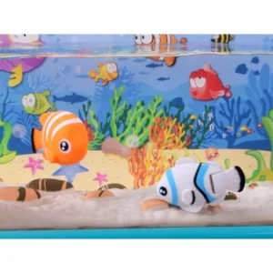 • Az akvárium USB-vel működik, a játék áramforráshoz csatlakoztatása után az akvárium világít. Négy vízsugár áramlik a játék tetejéről, hogy buborékokat hozzon létre az akváriumban. Az akvárium fedelén található kapcsolóval kellemes dallam is bekapcsolható. A fény folyamatosan világít az akváriumban, ami nagyon kellemes hangulatot teremt. A készletben található botok lehetővé teszik a gyermek és a szülők számára, hogy élvezhessék a horgászatot. Természetesen az nyer, aki először fogja ki a halat! Számtalan ötlet van az akváriummal való szórakozásra.