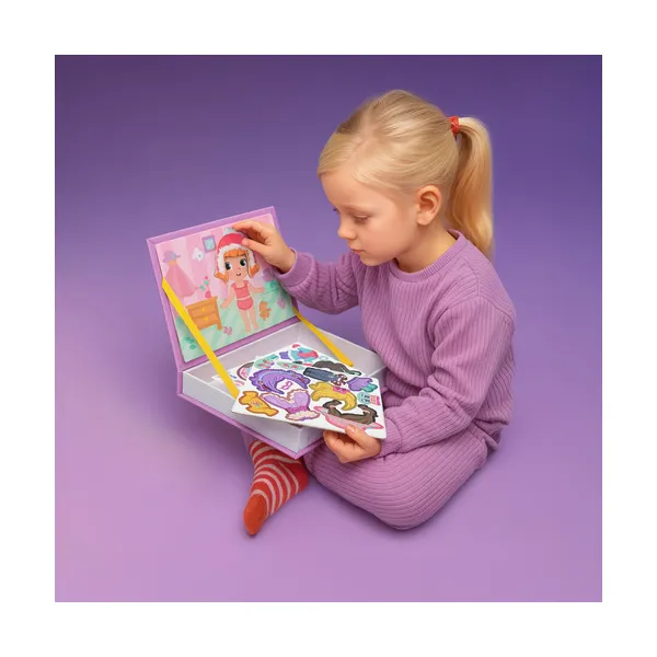 A mágneses öltöztetős puzzle kreatív és fejlesztő játék, amelyben a gyerekek saját divatterveket alkothatnak. A 51 darab ruhadarab, frizura és kiegészítő mágnesesen tapad a fémlapra, így a kombinációk száma szinte végtelen. A kartonból készült, könyv formájú doboz nemcsak elegáns, hanem megkönnyíti a tárolást és az utazást is.