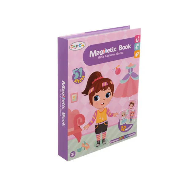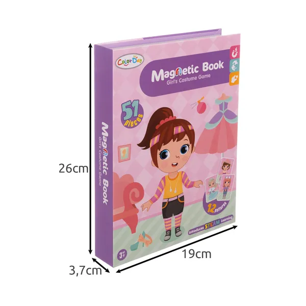 51 mágneses ruhadarabbal és kiegészítővel a gyerekek végtelen divatkombinációkat hozhatnak létre, miközben fejlődik a kreativitásuk. A könyv formájú doboz praktikus tárolást és könnyű hordozhatóságot biztosít játék közben vagy utazáskor.