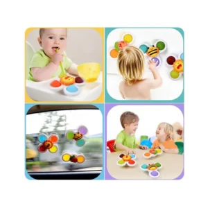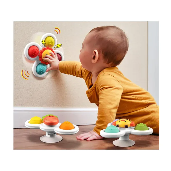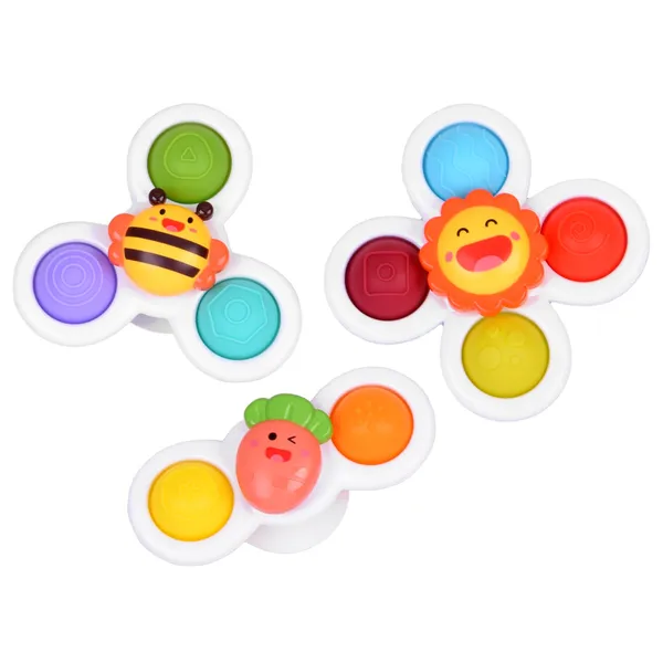 Három vidám, tapadókorongos fidget spinner, amelyek pancsolás közben is pörögnek, nyomkodhatók, és fejlesztik a finommotorikát – bárhol, bármikor egyszerűen rögzíthetők.