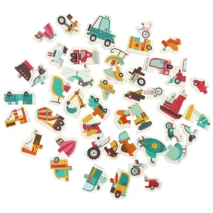 Színes, járműveket ábrázoló kirakó, amely 24 darab 5,5 × 6 cm-es puzzle-elemből áll. A tartós fémdoboz megkönnyíti a tárolást és az utazásokra való elvitelét.