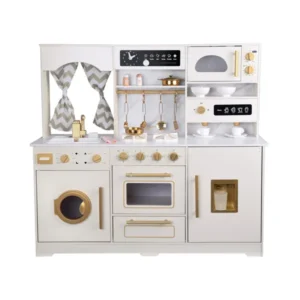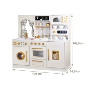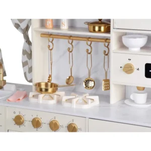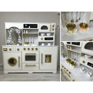 Stílusos, fa konyha elegáns, ragyogó stílusban, dekoratív arany akcentusokkal. Ez a készlet egyedi választás minden fiatal séf számára, és azoknak a szülőknek, akik értékelik az esztétikát és a magas minőséget! Tökéletes világos, légies belső terekhez, vonzó a fa, márvány és kifinomult részletek kedvelőinek. A modern dizájn és a valósághű funkciók nemcsak örömforrást jelentenek, hanem gyönyörű kiegészítést is a gyerekszobában.