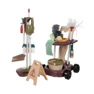 • NAGY KIEGÉSZÍTŐ KÉSZLET – a készlet rendkívül gazdag különféle kiegészítőkben, amelyek tökéletesen utánozzák a valódi takarító eszközöket. Itt található egy felmosó vödörrel és szitával, mikroszálas poroló, szivacs, kendő, figyelmeztető tábla és különféle takarító eszközök – súrolókefe, tisztítószivacs és mikroszálas kendő.