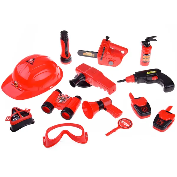 13 részes tűzoltó sisakos játékkészlet láncfűrésszel és szerszámokkal