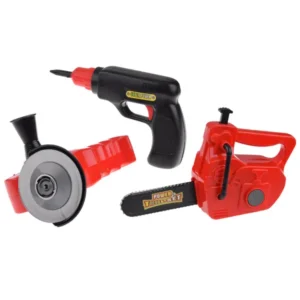 Interaktív élmény: A láncfűrész gombnyomásra mozgatja a láncot, a sarokcsiszoló pedig elemről forgó tárcsával teszi még élethűbbé a játékot.