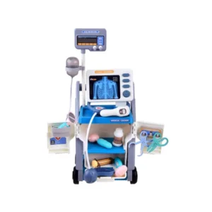 Orvosi kocsi kiegészítőkkel kis orvosoknak. Kiváló felszerelés gyerekeknek, hogy orvososat játszhassanak. A praktikus kocsi tartalmazza az összes szükséges kiegészítőt. Egy ilyen készletnek köszönhetően minden baba, plüssmackó, más játék, és valószínűleg a szülők vagy nagyszülők is mindig egészségesek lesznek. A kis orvos megméri a hőmérsékletet, injekciót ad, megvizsgálja a szívet és a látást, röntgent készít, és bármi mást, ami eszébe jut.