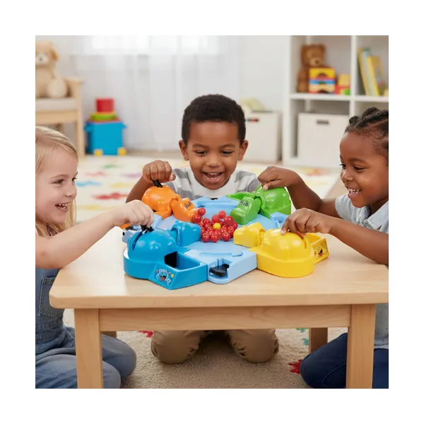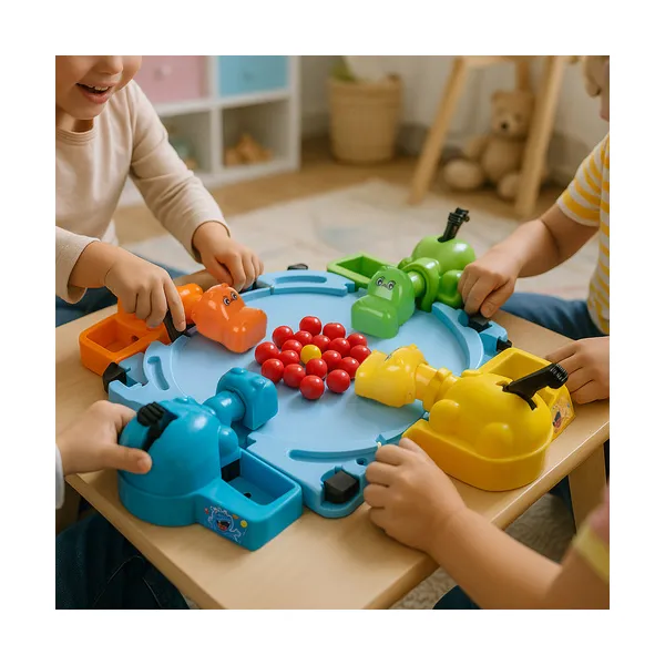 A Falánk Vízilovak pörgős ügyességi társasjátékban a játékosok feladata, hogy vízilovaikkal a lehető legtöbb golyót „nyeljék le”. A nagy, ergonomikus karoknak köszönhetően a kisebb gyerekek is könnyedén kezelhetik, így a móka az első pillanattól garantált. A gyors reakció és a jó kéz-szem koordináció itt aranyat ér, ezért a játék nemcsak szórakoztat, hanem reflexet és motoros készségeket is fejleszt.