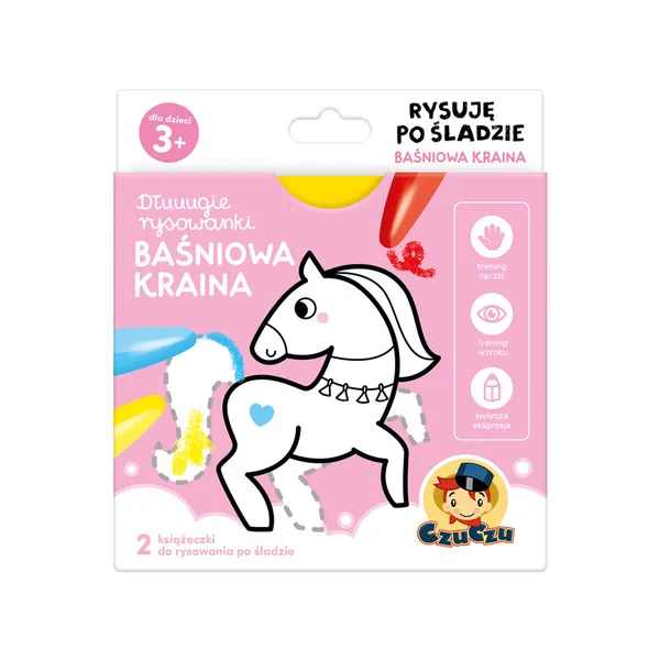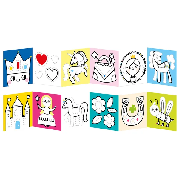 Két harmonikaszerűen kihajtható, extra hosszú színezőkönyv várja a kicsiket lenyűgöző lovas-tündéres illusztrációkkal, amelyeket átrajzolhatnak, kiszínezhetnek, és saját ötletes részletekkel is kibővíthetnek. A kompakt formátum elfér táskában vagy az autó hátsó ülésén, miközben játékosan fejleszti a finommotorikát, színfelismerést, koncentrációt, képzelőerőt és történetmesélést.