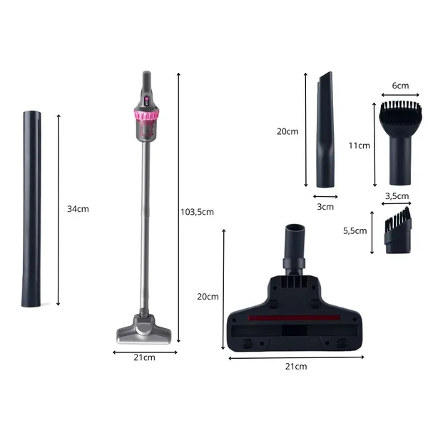 • Tartozékok: résszívó, kárpitkefe, nagy padlókefe, kefés résszívó, 2 hosszabbító cső, USB töltőkábel.