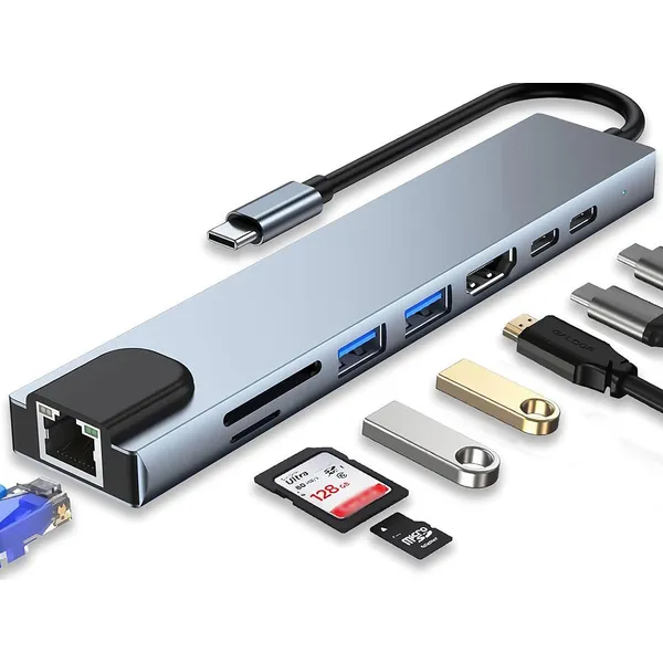 8 az 1-ben USB-C Thunderbolt 3 hub, HDMI 4K, RJ45, SD/TF, 100 W PD