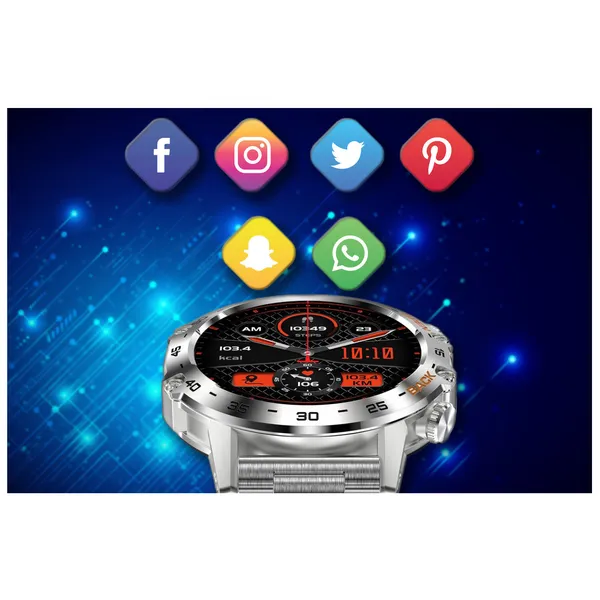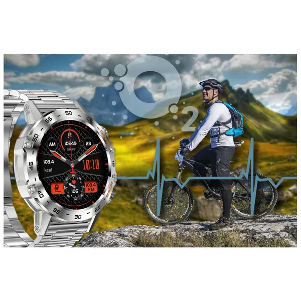 Elegáns, fémházas férfi okosóra 1,39” nagyfelbontású érintőkijelzővel, amely Bluetooth-on hívásokat kezel, méri a vérnyomást, pulzust és SpO2-t, továbbá 7 sportmóddal, IP67 védelemmel és 400 mAh akkumulátorral támogatja aktív életmódodat.