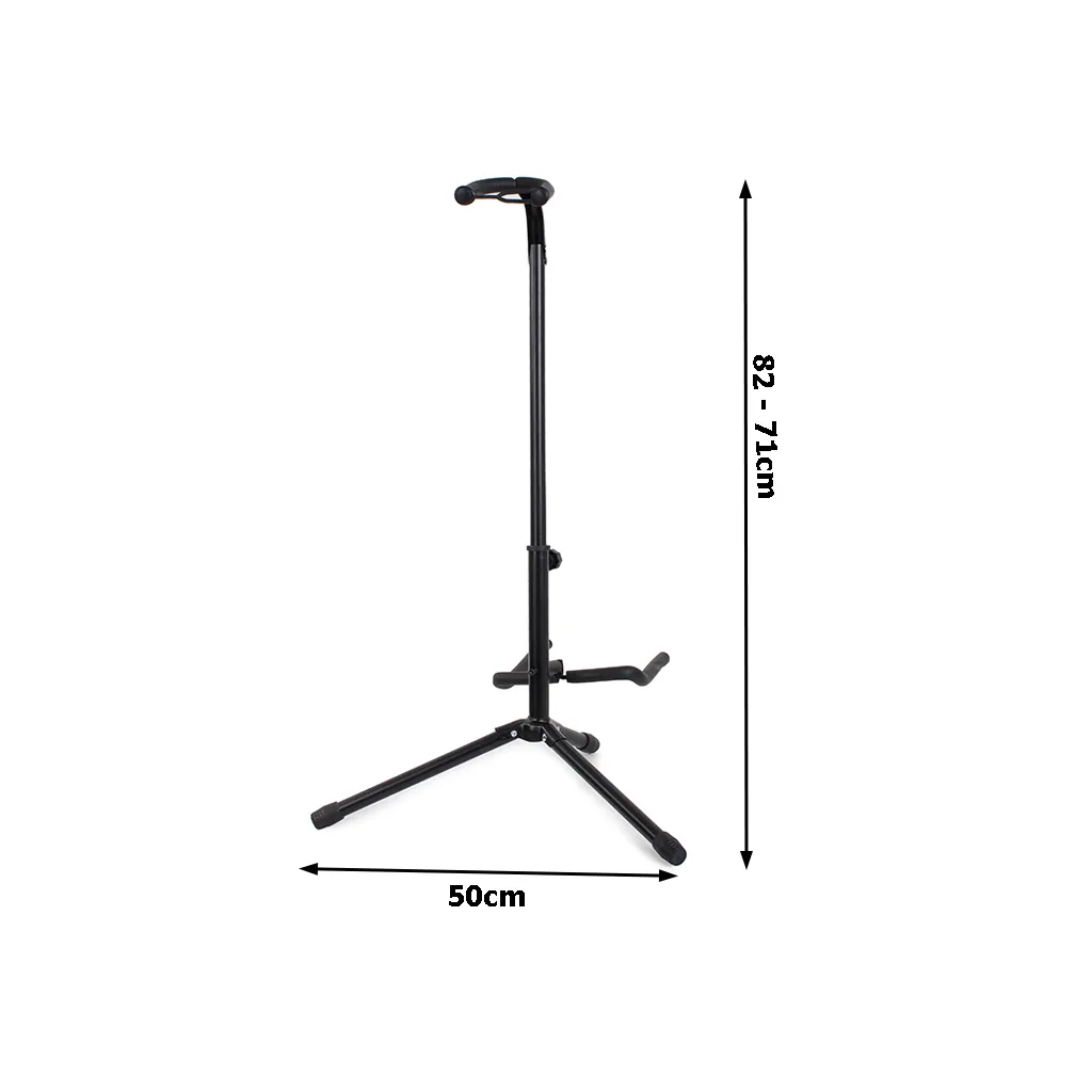 Állvány illik klasszikus, akusztikus, elektromos és basszusgitárhoz. Könnyű és kényelmes, biztonsági reteszeléssel a nyaknak. Állítható magassága 82 cm és 71 cm között állítható, hogy megfeleljen a különböző gitármagasságoknak.