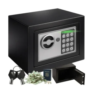 Acélból készült, elektronikus kóddal és vésznyitó kulccsal ellátott széf, amely megbízhatóan védi értékeit. Kompakt méretének és a mellékelt tipliknek köszönhetően gyorsan falra vagy polcra rögzíthető, a hibás kódriasztás pedig plusz nyugalmat ad, és otthon, irodában vagy hotelszobában is diszkréten elfér.