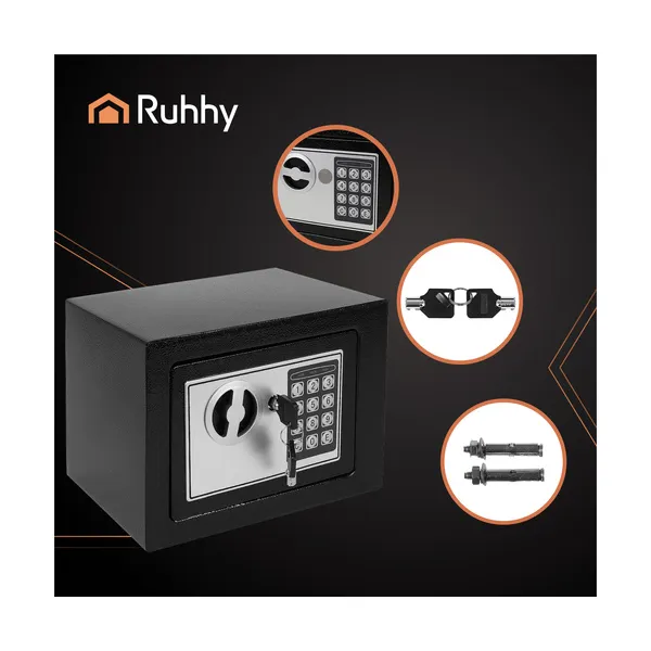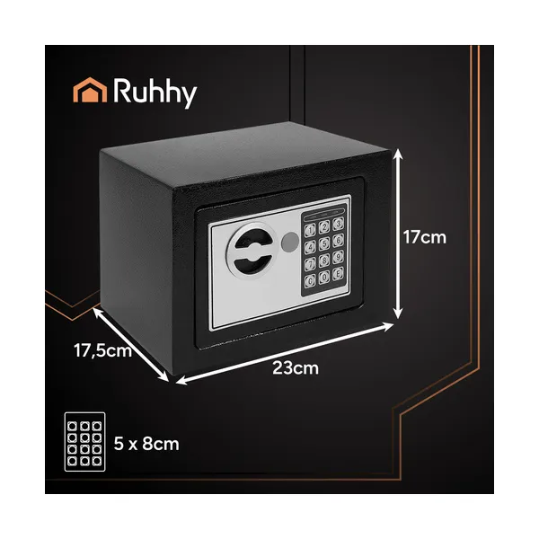 Ruhhy fekete acél elektronikus széf 23×17×17,5 cm kóddal és vésznyitó kulccsal