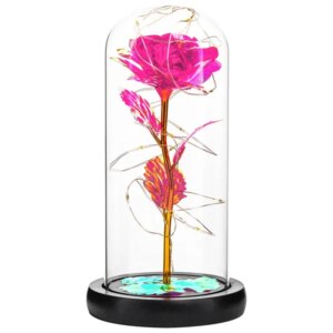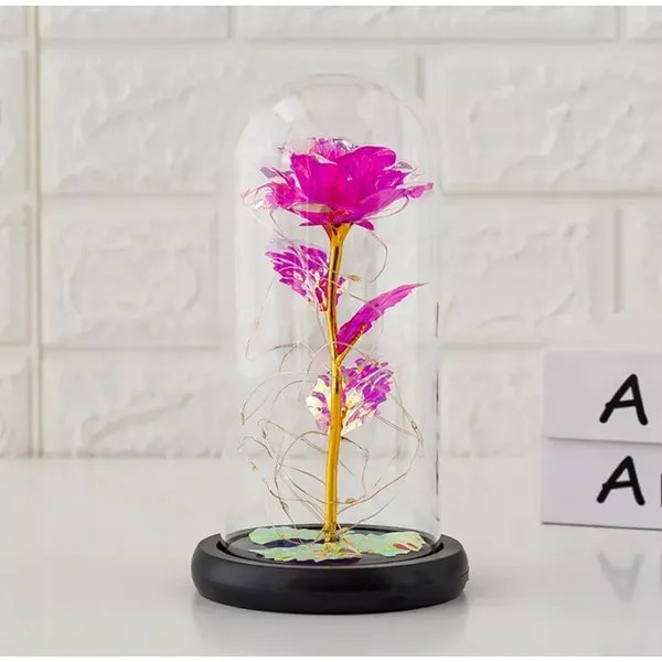 Az örök rózsa nem hervad el, így éveken át megőrzi romantikus szépségét. A rózsaszín szirmokat aranyszínű szár tartja, melyet átlátszó, 19 cm magas üvegbúra véd. A beépített RGB LED-ek színváltó fénye napnyugta után is látványossá teszi a kompozíciót, ezért éjjeli fényként is használható.