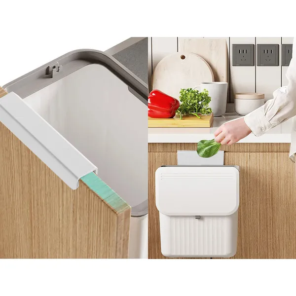 Praktikus és helytakarékos megoldás a konyhai vagy fürdőszobai hulladék számára: akaszd egyszerűen a szekrényajtóra, vagy ragaszd a falra – fúrás nélkül.