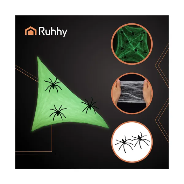 Szeretnél valóban hátborzongató díszítést, amely nappal is látványos, sötétben pedig igazi „wow” élményt nyújt? A RUHHY fluoreszkáló pókháló rugalmas szálai pillanatok alatt körbefonják az ajtókat, falakat vagy bútorokat, majd a fény eloltása után misztikus zöldes derengéssel ijesztik meg a vendégeket.