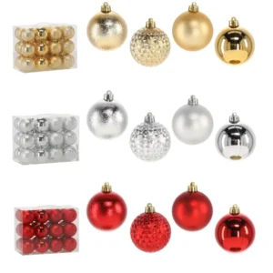 24 darab, 6 cm-es piros, arany és ezüst gömb, törhetetlen műanyagból, változatos felülettel, praktikus tárolódobozban – esztétikus, biztonságos és újrahasználható dekoráció a fenyőfához vagy kreatív ünnepi kompozíciókhoz.