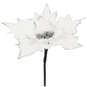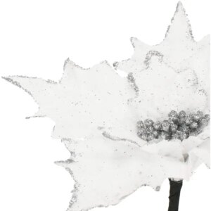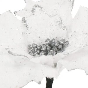 Hozz egy csipetnyi eleganciát az ünnepi dekorációba ezzel a fehér-ezüst csillámos, 26 cm átmérőjű mű mikulásvirággal. A selymes poliészter szirmok finom ezüst glitterrel vannak bevonva, amely gyönyörűen veri vissza a karácsonyi fényfüzérek szikráit. Használható karácsonyfadíszként, koszorúkhoz, asztaldíszekhez vagy ajándékcsomagok egyedi kiegészítőjeként.