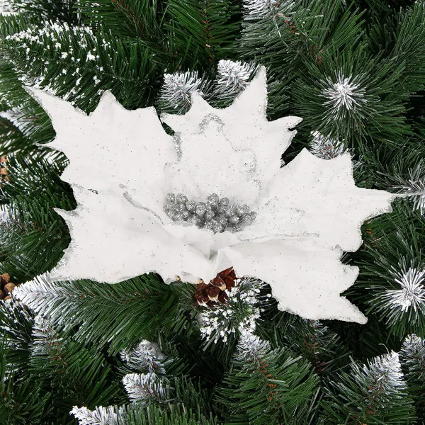 Csillámló fehér-ezüst szirmaival ez a 26 cm-es mű virág azonnal eleganciát és fényt ad a fának, koszorúnak vagy ünnepi asztalnak. Könnyen formázható, nem hullik, így évről évre újrahasznosítható, pénztárcabarát megoldás.