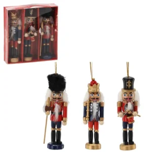 Varázsolj klasszikus, mesebeli hangulatot otthonodba ezzel a 3 darabos, 13 cm magas fa diótörő katona karácsonyfadísszel! A kézzel festett figurák részletgazdag kidolgozásuknak köszönhetően igazi ékkövei lesznek a fenyőfának, ajtódísznek vagy ünnepi asztaldísznek.