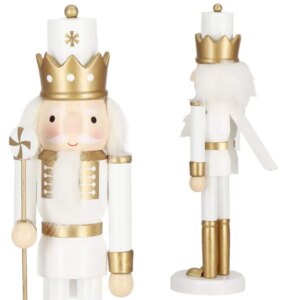 Az ünnepi lakásdekoráció ikonikus darabja a kézzel festett, 30 cm magas fa diótörő, amely fehér-arany ruhájával és koronájával elegáns, mégis játékos hangulatot visz a nappaliba, az irodába vagy a kirakatba.