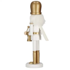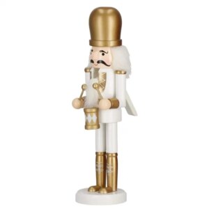 A 30 cm-es, kézzel festett fa diótörő meleg, ünnepi hangulatot és kifinomult arany-fehér csillogást visz otthonába. Stabil talpa és mozgatható karja tartós, játékos dekorációvá teszi, amely azonnal magára vonzza a vendégek tekintetét.
