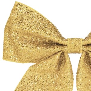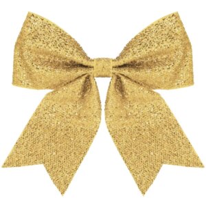 Elegáns arany karácsonyi masni látványos, fényes fóliaborítással, amely azonnal ünnepi hangulatot varázsol bármilyen dekorációba. A 22 cm magas és 20 cm széles masnit vékony (0,5 mm) műanyag alap és praktikus aranyszínű drót teszi könnyen rögzíthetővé.