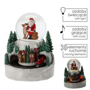 Karácsonyi zenedoboz LED-es téli város hó gömbbel, forgó vonattal