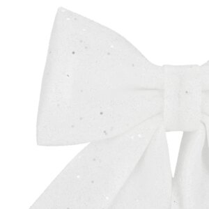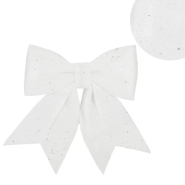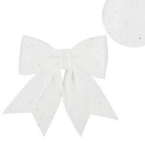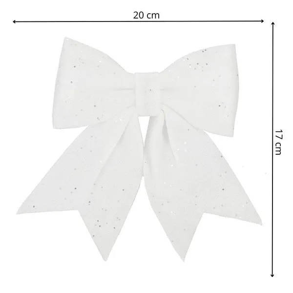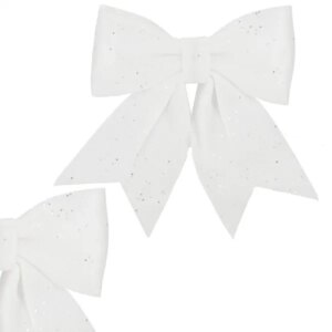 Hófehér, csillámos karácsonyi masni, amely beépített dróttal egyszerűen rögzíthető a karácsonyfára, ajándékcsomagra vagy koszorúra, így azonnal ünnepi fényt varázsol bármely dekorációra. 17×20 cm-es mérete látványos hatást, strapabíró anyaga pedig többszöri felhasználást biztosít.