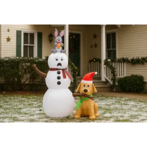 Hozzon létre mesebeli karácsonyi hangulatot otthonában vagy a kertben ezzel a vidám, 180 cm magas, LED-világítással ellátott felfújható hóemberrel, amely Mikulás-sapkás kutyájával és répát majszoló nyuszijával minden korosztályt mosolyra fakaszt.