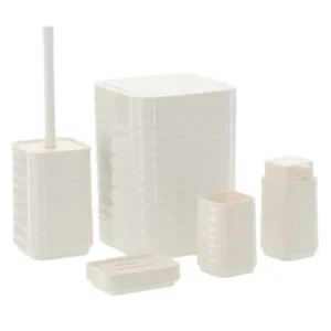 A modern, négyzetes formájú, 5 darabos fürdőszobai szett tartós, könnyen tisztítható műanyagból készült, hogy stílusos megjelenést és praktikus rendet nyújtson a mindennapokban.