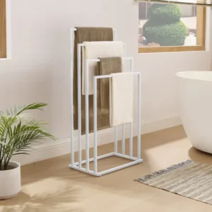 • Szabadonálló fehér törölközőtartó 4 rúddal, acél, 45×29×93 cm