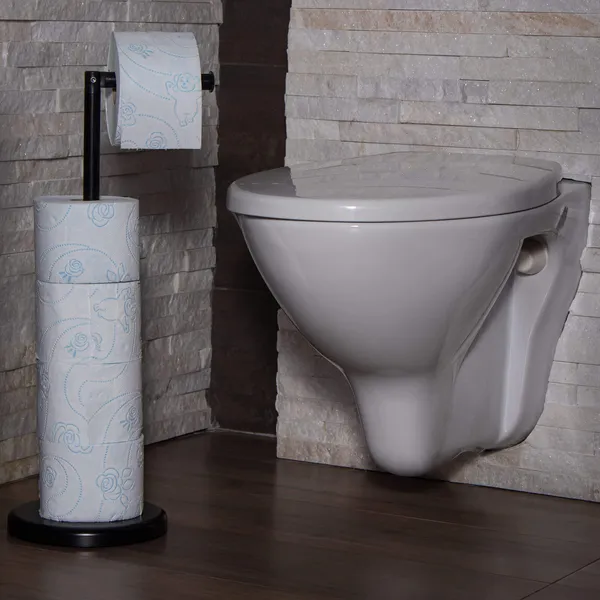 Elegáns, matt fekete kialakítású, szabadon álló WC-papír tartó, amelyet a nehéz fém talp stabilan a helyén tart. A mozgatható kar gyors és kényelmes tekercscserét biztosít, így a papír adagolása mindig zökkenőmentes.