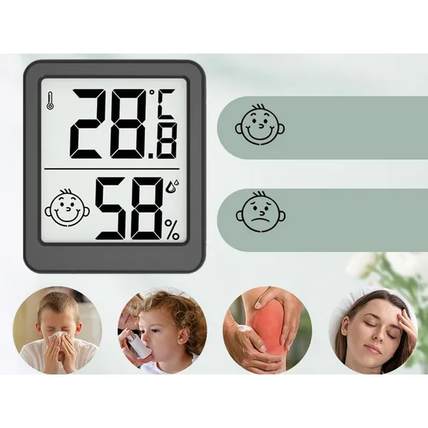 Egyetlen tenyérnyi eszközben figyelheti a hőmérsékletet és a páratartalmat. A nagy kontrasztú LCD-kijelzőn mosolygós ikon jelzi, ha a levegő optimális, így azonnal beavatkozhat a kellemes közérzet érdekében.