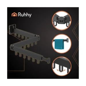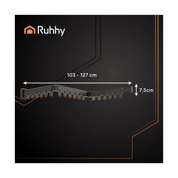 A Ruhhy falra szerelhető, háromrészesen összecsukható ruhaszárítóval értékes alapterületet takaríthatsz meg a fürdőben, erkélyen vagy mosókonyhában. Az alumínium váz könnyű, mégis masszív, így akár súlyosabb törölközők vagy ingek alatt sem hajlik meg. A karok 103–127 cm között kihúzhatók, majd használat után egyetlen mozdulattal visszacsukhatók, hogy a szárító szinte teljesen a fal síkjába simuljon.