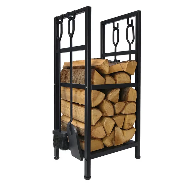 Tűzifa állvány 2 polccal és 4 szerszámmal, acél, 80 kg, beltéri/kültéri