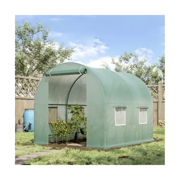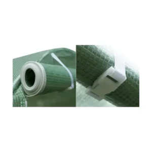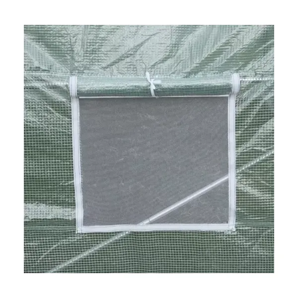 Erős, UV-álló 140 g/m² PE fólia beépített hálóval, cipzáras ajtóval és szúnyoghálós ablakokkal biztosítja a stabil mikroklímát, gyorsítja a növények fejlődését és meghosszabbítja a termesztési szezont.