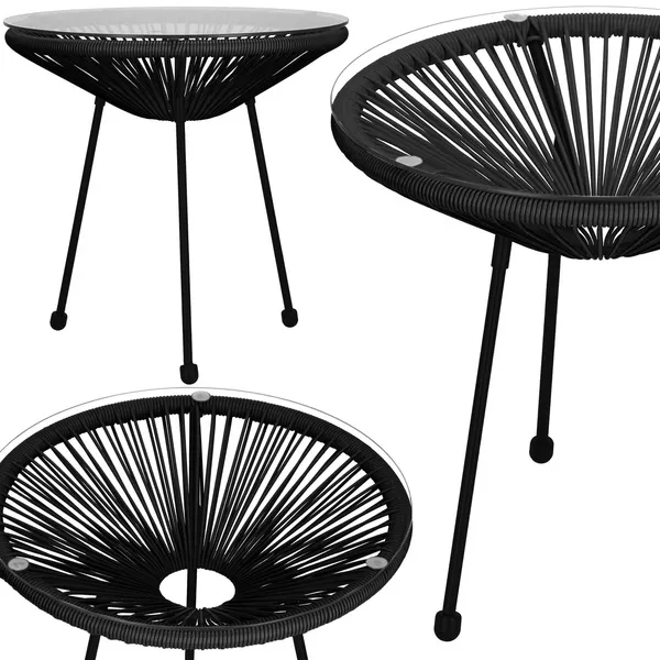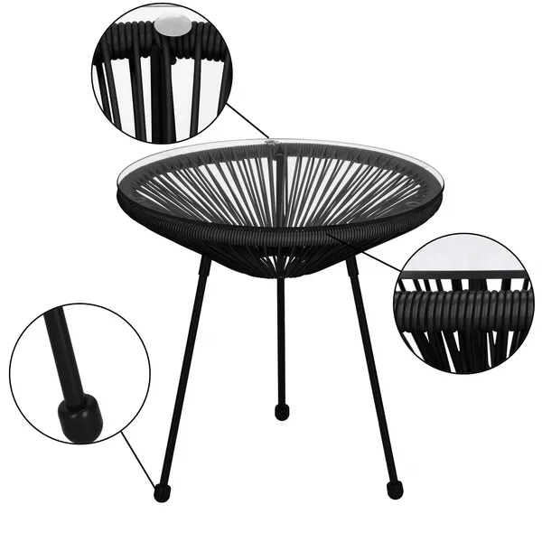 Fekete kerti rattan oldalasztal 50 cm üveglappal, 3 lábbal