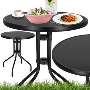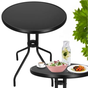 Stílusos fekete kültéri asztal edzett üveglappal, amely korrózióálló fémszerkezetével, 60 kg teherbírásával és időjárásálló bevonatával megbízható társ a teraszon vagy erkélyen egész szezonban. Kompakt, 60 cm-es átmérője kényelmes helyet biztosít kávézáshoz két főnek, stabilan áll a 22 mm-es csőlábakon, így egyszerűen mozgatható, és percek alatt, szerszám nélkül összeszerelhető.
