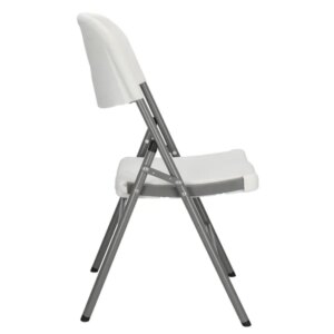 Összecsukható, könnyen tisztítható fehér szék 150 kg teherbírással és beépített hordozófogantyúval, amely kis helyet foglal, mégis stabil ülőhelyet biztosít otthon, kertben vagy rendezvényeken.