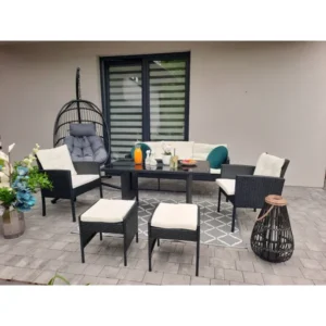 A Vaduz 6 részes rattan kerti garnitúra elegáns, fekete színű vázzal és bézs ülőpárnákkal teszi otthonossá a teraszt, erkélyt vagy kertet. Időjárás-álló kialakításának és kényelmes, vastag párnáinak köszönhetően tökéletes választás a családi és baráti összejövetelekhez.