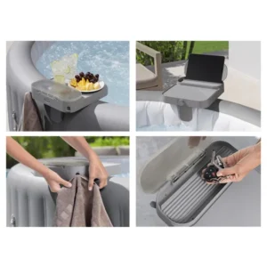 A 4 az 1-ben Bestway polc ital- és snackasztalként, fröccsenésálló tárolóként, törölköző- és tablet-/telefontartóként szolgál, állítható lábaival minden Lay-Z-Spa felfújható pezsgőfürdő peremére biztonságosan rögzíthető. Maradj a vízben, és élvezd, hogy minden szükséges dolog karnyújtásnyira van, így a pihenés valóban zavartalan marad.